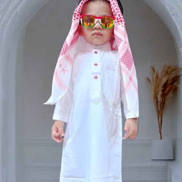 The Kids Arabian Haji Set is crafted from Korian Micro Stitch Fabric, a premium material known for its exceptional softness and durability. This lightweight fabric provides a breathable experience, making it perfect for active children. It is designed to withstand everyday wear, ensuring that your child remains comfortable during various occasions, whether it’s the sacred journey of Hajj, Eid celebrations, or family gatherings. The luxurious feel of the fabric combined with its elegant appearance reflects the richness of Islamic heritage, making this set not only stylish but also a cherished addition to your child’s wardrobe.